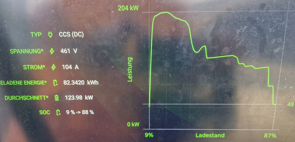 Zurück in Wien lande ich beim Schnellader am Verteilerkreis mit 8% Ladestand. Nun werde ich bis zumindest 80% aufladen und mir dann die Ladekurve ansehen. Beginnend mit 204kW Ladeleistung bis ca. 35% SOC, danach weiter mit ca. 120 kW durchgehend bis knapp unter 80% SOC. Bis dahin vergehen gerade mal 30 Minuten, das ist ein toller Wert, wenn man bedenkt, dass wir hier einen Akku mit über 100 kWh laden!