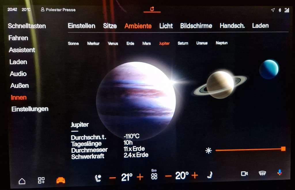Die Ambiente Beleuchtung kann man sich über ein spezielles “Sterne Menü” einstellen. Hier kommt Polestar auch gleich dem Bildungsauftrag über Sternenkunde nach, während man die richtige Farbe aussuchen kann.