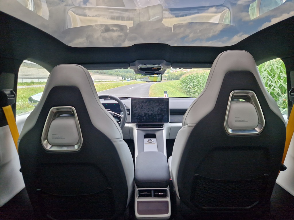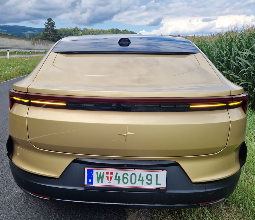 Eine Besonderheit des Polestar 4 ist der Verzicht auf ein klassisches Heckfenster. Stattdessen setzt das Fahrzeug auf eine hochauflösende Dachkamera, die ihr Bild an den innenspiegelähnlichen Bildschirm im Innenraum überträgt. Diese Lösung ist zunächst gewöhnungsbedürftig, erweist sich jedoch in der Praxis als Vorteil, da die Kamera auch in Extremsituationen, wie zum Beispiel bei Dunkelheit oder Regen ein hervorragendes Bild liefert. Die Fokussierung des Bildschirmes im Rückspiegel ist allerdings am Anfang etwas gewöhnungsbedürftig. Speziell dann, wenn man wie ich mit Gleitsicht Brille fährt, fällt die Fokussierung des übermäßig kontrastreichen Bildschirms manchmal schwer. Aber man gewöhnt sich dran und dann ist es nur noch genial …